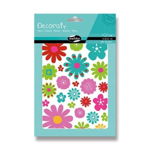Samolepky Maildor Decoraty s motivy květin. Možnost kombinování výtvarných aktivit jako je kreslení a použití samolepek. Balení obsahuje 6 listů, 2 motivy po 3 ks. Samolepky lze sloupnout a znovu nalepit. Rozměry balení: 14,8 x 21 cm.