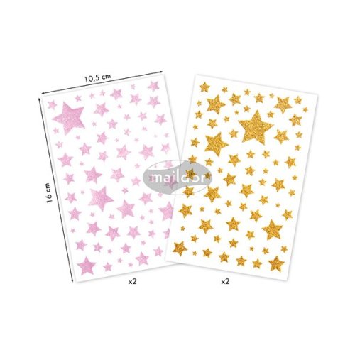 Samolepky Maildor Glitty s motivy hvězd v zářivě třpytivém provedení. Balení obsahuje 2 listy, 2 motivy po 1 ks. Samolepky lze sloupnout a znovu nalepit. Rozměry balení: 10,5 x 16 cm.