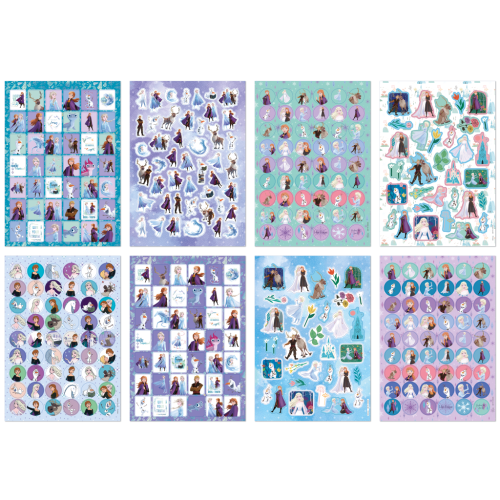 Třpytivé samolepky s motivem postaviček z pohádky Ledové království. V sešitu 8 archů. Rozměry 15x21 cm. Věk 3+