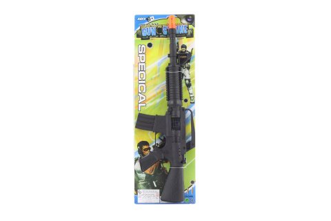 Plastový samopal rachtací. Není na náboje. Baleno na kartě. Rozměry balení 14x43x3,5 cm. Délka zbraně 42 cm. Věk 3+