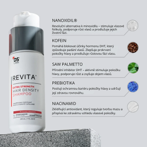Revita šampon s 5 % Nanoxidilem přichází v nové, posílené verzi s dvojnásobnou koncentrací aktivních látek a trojicí DHT blokátorů. Okamžitě redukuje vypadávání vlasů, stimuluje jejich růst a zanechává je silnější, hustší a odolnější. Obsahuje i JAK inhibitory, které brání imunitnímu systému poškozovat vlasové folikuly. Účinky jsou viditelné již po 90 dnech pravidelného používání. Vhodný pro muže i ženy.