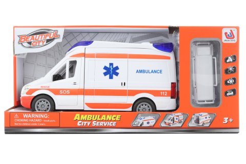 Plastová sanitka na baterie s nosítky. Sanitka vydává zvuky a svítí. Napájení na 2 AA baterie (jsou součástí). U sanitka lze otevírat dveře (včetně zadních). Rozměry sanitky cca 24,5 x 12,5 cm. Rozměry balení cca 37 x 17,5 x 11,5 cm. Věk 3+
