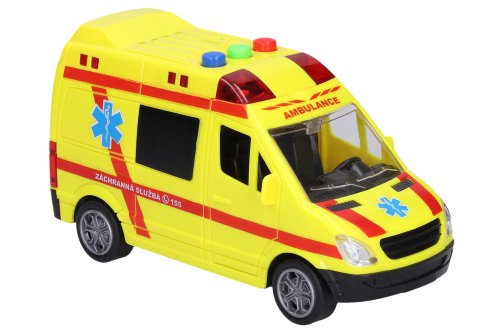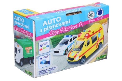 Sanitka - Míša Růžičková. Velikost 14,5 cm. Na setrvačník. Světelné a zvukové efekty, tlačítky na střeše auta 3 písníčky Míši Růžičkové - Sanitka, Policejní, Popeláři. 3xAG13 baterie součástí.