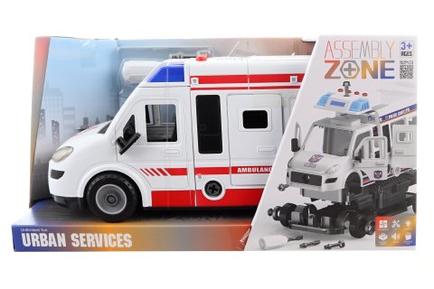 Velká šroubovací sanitka. Napájení na 3 AG13 baterie, které jsou součástí balení. Sanitka má 4 tlačítka - houkání, troubení, startování, melodie. Strana řidiče má otevírací všechny dveře, zadní část na nosítka je také otevíratelná. Materiál plast. Baleno v otevřené krabici. Balení obsahuje šroubovák. Rozměry sanitky cca 31x14x14 cm. Rozměry balení cca 34,5x18,5x15 cm. Věk 3+