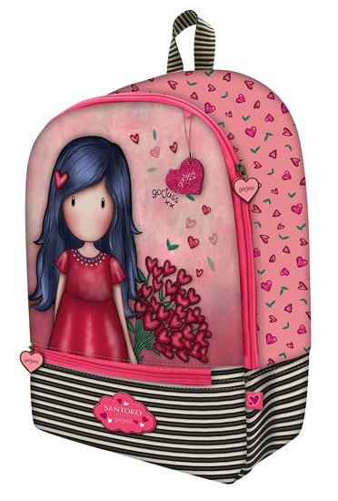 Tento školní batoh má celkem dvě komory, které mají pouze jeden hlavní prostor. Zadní komora má vyztužené dno, dvě našité kapsy např. na mobil a jednu kapsu na zip. Obě dvě komory se uzavírají na dvoucestný zip. Všechny zipy jsou ozdobeny přívěskem. Záda batohu jsou polstrovaná, stejně jako popruhy, které jsou nastavitelné. Na přední straně je ještě jedna kapsa uzavíratelná na zip. Panenka Gorjuss je vyobrazena na třpytivé látce. Rozměry: 32 x 45 x 13,5 cm.