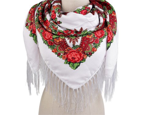 Velký folklórní šátek je doslova jako z dob našich babiček. Býval součástí tradičního oblečení a krojů. Je vyrobený z příjemného materiálu, na všech stranách je ozdobený dlouhými střapci, které krásně splývají. Velký čtvercový tvar můžete variabilně upravit, využijete jej jak při nošení pod krkem, tak i na zádech. [Upozorňujeme zákazníky, že květy na šátcích se mohou lišit. Může se lišit i složení na štítcích, materiál je polyester. Děkujeme za pochopení.]