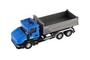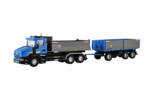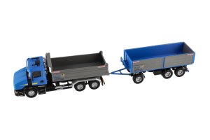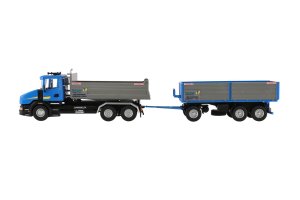Model Scania MS 65 Tarmac s návěsem v měřítku 1:48. Obě korby jdou vyklápět, stejně tak i kapota motoru. Stavebnice patří do skupiny Profi.