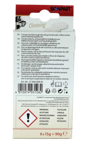 Odstraňovací tablety Scanpart jsou určeny pro snadné a důkladné odvápnění automatických kávovarů a domácích spotřebičů. Produkt nabízí efektivní čištění kávovarů, plně automatických kávovarů a zařízení na horkou vodu. Díky obsahu kyseliny amidosulfonové jsou tyto tablety výrazně rychlejší než běžná kyselina citronová. Balení obsahuje 6 tablet po 15 g, které zajišťují dlouhodobou péči o váš kávovar.