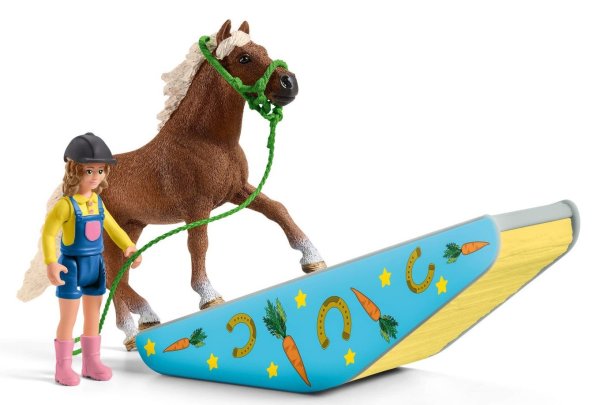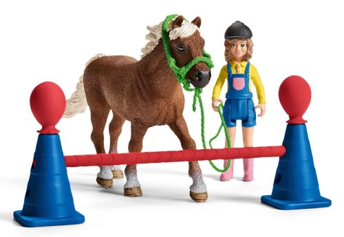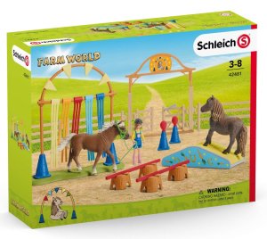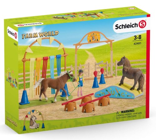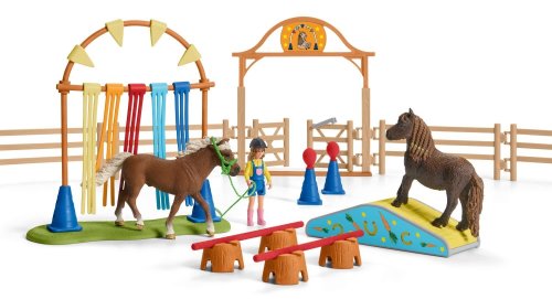 Balení obsahuje: figurku klasického a shetlandského pony, figurku dívky, jezdeckou helmu, uzdu, vodicí lano, ohradu se vstupní bránou, 6 překážek, arch nálepek