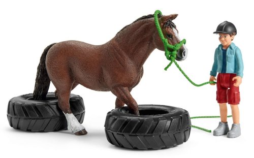 Balení obsahuje: velšského pony, figurku chlapce, jezdeckou helmu, uzdu, vodicí lano, pohár, překážky, 2 vlajky start-cíl, arch nálepek
