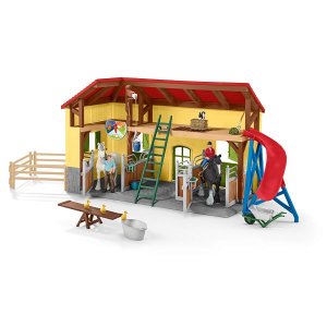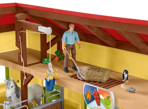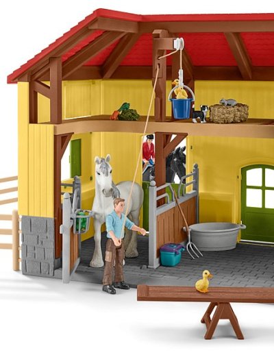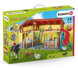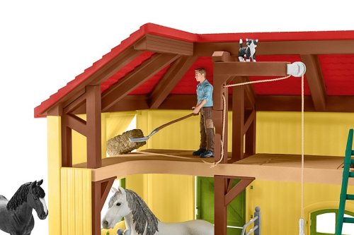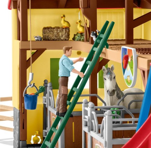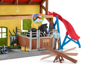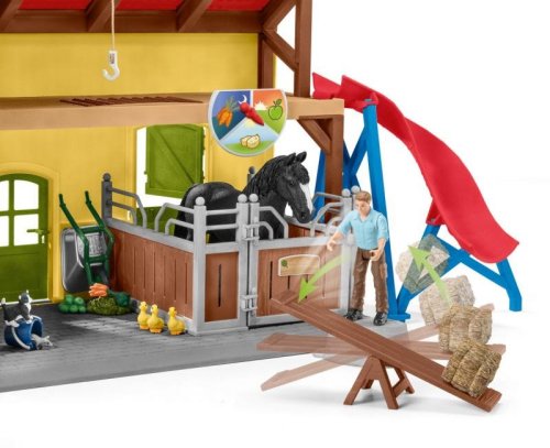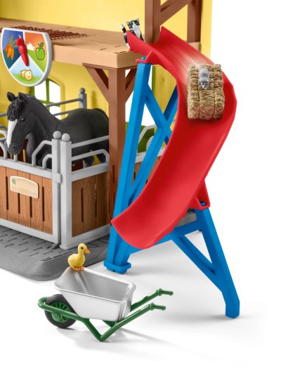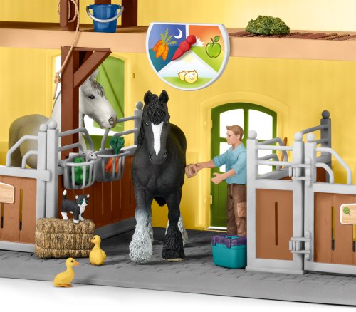 Nová barevná stáj pro koně nabízí spoustu zábavných funkcí a poskytuje nekonečnou zábavu! Napodobovat denní práci na farmě je tak snadné s pomocí farmářů Paula, Laury a sedmi roztomilými zvířaty. Zatímco se farmářova žena připravuje na jízdu na koni, zemědělec Paul přepravuje nové krmivo do seníku kladkostrojem. Uložení balíků sena na půdě je velmi snadné díky pohyblivým transportním válečkům, které mu práci velmi usnadňují. Pomocí skluzavky dostane seno zase rychle dolů. Hodiny na krmení jsou nastaveny podle toho, jaké krmivo zvířata potřebují. Objeví farmář roztomilou myšku sedící v myší díře? Děti si mohou stáj ozdobit samolepkami, jakkoliv chtějí. Figurky Schleich jsou modelovány v nejjemnějších detailech a povzbuzují děti k hraní a učení. Figurka Laury může jezdit na koni a má pohyblivé ruce. Figurka Paula má pohyblivé ruce. Obsahuje: 1× shirská klisna, 1× shirský hřebec, 3× kachňata, 1× kotě, 1× myš, 1× farmář, 1× farmářka, 1× sedlo, 1× koňská stáj, 1× skluzavka na krmení, 1× houpačka, 1× žlab, 4× výběh, 1× žebřík, 1× jablko (zelené), 1× mrkev, 1× balík sena, 1× kupka trávy, 1× vidle, 1× kyblík, 2× krmítko, 1× hřeblo, 1× krabice na čištění, nálepky, 1× ukazatel krmení. Rozměr cca: 60 x 40 x 29,5 cm. Rozměr balení: 49 x 34,5 x 10,5 cm. Nevhodné pro děti do 3 let. Doporučený věk: 3-8. Video: https://www.youtube.com/watch?v=vGduz9r28vk