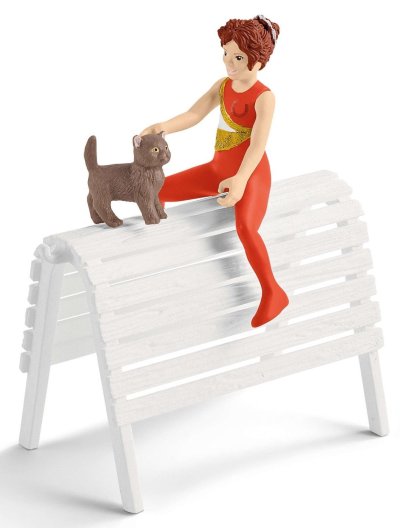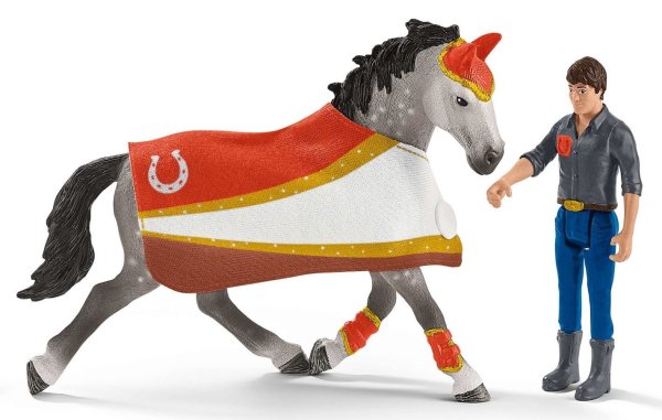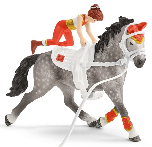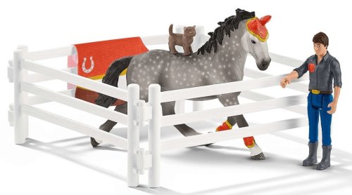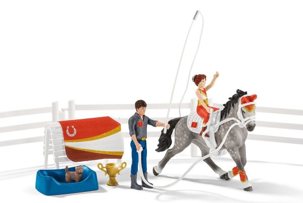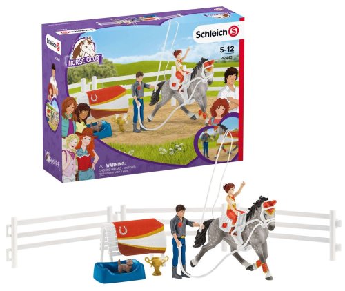 Kdo vyhraje velkou soutěž? Figurky a doplňky z kolekce Horse Club jsou propracovány do posledního detailu a přiblíží ti život ve stáji a kolem ní. Pronikni do světa chovu koní, nasbírej figurky a pořiď si vlastní jezdeckou stáj. Balení obsahuje: 1x holčička Mia s pohyblivými pažemi, 1x trenér Tom s pohyblivými končetinami, 1x turnajový kůň, 1x kočka, 1x sedlo, 1x uzda, 2x martingale, 1x lano, 1x bič, 1x přikrývka, 1x držák na přikrývku, 1x trofej, 1x koš, 4x ohrada Malá holčička Mia se může dokonale připravit na svou první soutěž se setem pro vaulting. Instruktor jízdy na koni, Tom, uklidňuje koně a jemně švihne bičem, který drží ve své ruce, takže kůň běží rovnoměrně v kruhu uvnitř plotu, který lze sestavit dle potřeby. Mia, sestra Hannah, má pohyblivé paže a dokáže držet velkou zlatou trofej. Sedlo, uzda a přikrývka lze sundat a po tréninku se ukládají na úložnou lavici. Hnědé kotě se zájmem sleduje události a poté se přitulí do svého útulného koše. Schleich jsou realistické a do detailů propracované figurky, kde se designeři soustředili na filozofii těla, strukturu svalů a celkový výraz postavičky. Děti si tak mohou hrát se zvířátky z celého světa, pravěkými dinosaury, filmovými a pohádkovými postavičkami, které jsou věrnou kopií svých předloh, a kouzelnými elfy a vílami z magického světa Bayala. Vhodné pro děti od 5 let.