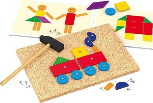 Tvořivá motorická hra pro malé kutily. Slon, raketa nebo motýl - s kladívkem, hřebíky a 50 dřevěnými díly v různých barvách a tvarech vznikají na stabilní korkové desce barevné obrázky. Předlohy v různých úrovních obtížnosti podporují jemnou motoriku malých řemeslníků a podněcují jejich fantazii k navrhování vlastních motivů. Pomocí kladívka děti jednoduše zaťukají tvary do korkové podložky a následně je mohou zase rozebrat. Balení obsahuje: korkovou podložku, 50 dřevěných dílků různých tvarů, hřebíčky, kladívko a předlohy.