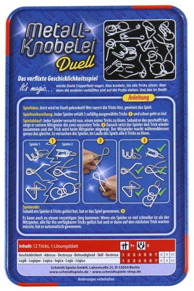 Dvanáct malých kovových hlavolamů SCHMIDT Metall-Knobelei Duell v plechové krabičce. Každý hlavolam je složen ze dvou částí. Úkolem je nejprve najít způsob, jak tyto dvě části bez použití síly od sebe úplně oddělit a následně je zase spojit k sobě do výchozí pozice. - 12 hlavolamů z kovu - princip rozlož a opět slož do původního tvaru - graficky znázorněné řešení součástí balení Hra pro dva hráče - duel: Každý hráč obdrží náhodné 3 hlavolamy. Jakmile některý z hráčů hlavolam vyřeší, ukáže protihráči obě oddělené části a opět hlavolam složí. Vítězem se stává hráč, který nejdříve vyřeší všech 6 hlavolamů. Pokud má některý z hráčů vyřešeny všechny dostupné hlavolamy a musí čekat na poslední, pak automaticky vyhrává. Doporučeno od 7 let.