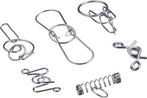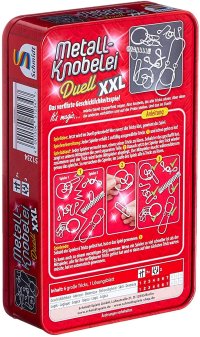 Šest větších kovových hlavolamů SCHMIDT Metall-Knobelei Duell XXL v plechové krabičce. Každý hlavolam je složen ze dvou částí. Úkolem je nejprve najít způsob, jak tyto dvě části bez použití síly od sebe úplně oddělit a následně je zase spojit k sobě do výchozí pozice. - 6 hlavolamů z kovu - princip rozlož a opět slož do původního tvaru - graficky znázorněné řešení součástí balení Hra pro dva hráče - duel: Každý hráč obdrží náhodné 3 hlavolamy. Jakmile některý z hráčů hlavolam vyřeší, ukáže protihráči obě oddělené části a opět hlavolam složí. Vítězem se stává hráč, který nejdříve vyřeší všech 6 hlavolamů. Pokud má některý z hráčů vyřešeny všechny dostupné hlavolamy a musí čekat na poslední, pak automaticky vyhrává. Doporučeno od 7 let.