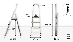 Výška schůdků: 1,45 m Pracovní výška: 2.75 m Výška podesty: 0,75 m Šířka: 0,43 m Nosnost: 125 kg Materiál: hliník/plast Hmotnost: 2,9 kg Přepravní rozměr: 145x43x12 cm