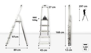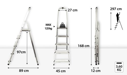 Výška schůdků: 1,68 m Pracovní výška: 2,97 m Výška podesty: 0,97 m Šířka: 0,45m Nosnost: 125 kg Materiál: hliník/plast Hmotnost: 3,6 kg Přepravní rozměr: 168x45x12 cm