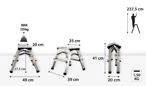 Výška schůdků: 0,41 m Pracovní výška: 1,98 m Výška podesty: 0,38 m Šířka: 0,39 m Nosnost: 125 kg Materiál: hliník Hmotnost: 1,5 kg