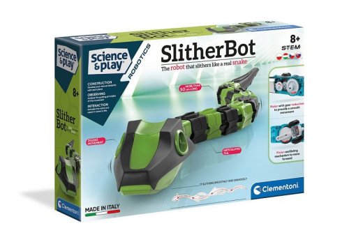 Sestavený had ožívá a začíná se plazit po místnosti jako skutečný! Sestavte si svého vlastního robotického hada se sadou Clementoni. Had je dlouhý 40 cm a je složen z 12 spodních a vrchních dílů. Hračka děti učí zábavným způsobem základy robotiky, pomáhá rozvíjet manuální dovednosti, logické schopnosti a představivost. Rozměr balení: 27,6 x 21 x 6 cm. Věk: 8+. Baterie: 2xAA (nejsou součástí balení).