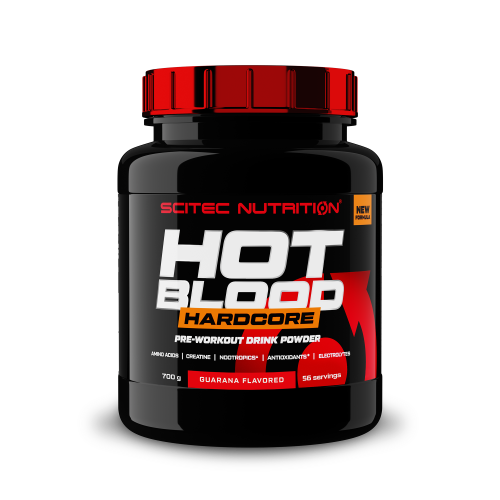 ! Obsahuje kofein, není vhodné pro děti a těhotné ženy. Denní dávka (25 g) obsahuje 300 mg kofeinu. Produkt není vhodný pro osoby trpící přecitlivělostí na kofein. Nová generace oblíbeného předtréninkového suplementu s vylepšeným složením! Scitec Hot Blood Hardcore je komplexní předtréninkový suplement, který se vyznačuje vysokým obsahem kofeinu, kreatinu, aminokyselin, nootropik, antioxidantů a elektrolytů. Obsahuje jednu z nejprozkoumanějších forem kreatinu - kreatin monohydrát, při kterém je dokázáno, že zvyšuje fyzickou výkonnost během krátkodobých po sobě následujících dávek velmi intenzivního cvičení. Pozitivní účinky se projeví už při denní dávce 3 g kreatinu. Přidaný vitamín B6 a niacin přispívají ke správnému fungování nervového systému. Zinek přispívá k normálním kognitivním funkcím. Vitamin C a E přispívají k ochraně buněk před oxidativním stresem. Folát, vitamín B12 a vitamin A přispívají ke správnému fungování imunitního systému. Chrom přispívá k normálnímu metabolismu makroživin. Biotin přispívá k správné metabolismu pro tvorbu energie. Doporučené dávkování:
