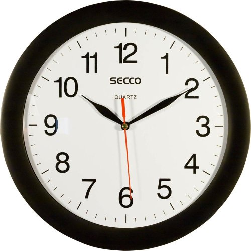 Nástěnné hodiny Napájení z baterie Rozměry 300 MM Pouzdro ve tvaru kruhu Plastové pouzdro ČERNÁ barva pouzdra Ručičkový ciferník Bílá barva ciferníku Ciferník s arabskými čísly