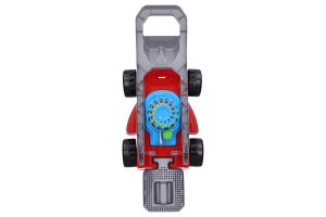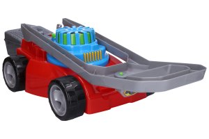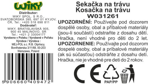 Sekačka na trávu. Složená sekačka 68(d) x 28(š) x 55(v) cm, včetně rukojeti. Velikost sekačky s košem bez rukojeti, 51x28x19 cm. Přední kolečka jsou volná, zadní kolečka při jízdě cvakají. V rukojeti je cvakající otočný spínač. Uprostřed sekačky je barevná rotující spirála, která se roztáčí vytažením, nebo zasunutím páčky.