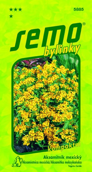 „TARRAGON MEXICKÝ“ – je příjemně aromatická cca 40 cm vysoká letnička. Tradičně se užívá čaj z aksamitníku pro zklidnění žaludku, k celkovému uvolnění a druhého dne jako rychlá pomoc po prohýřené noci. Nálev z celé rostliny se pije při bolestech břicha nebo se přidává do koupele při revmatických onemocněních. Potlačuje paranoidní stavy, využít ho můžete i při podávání silnějších stimulujících látek. Před řízením motorového vozidla mexický tarragonový čaj (ani jiné lektvary z něho připravené) raději neužívejte, mohl by Vás sice před jízdou uklidnit, ale třeba až moc a možná i navždycky. Květy i listy z chemicky neošetřovaných, doma vypěstovaných rostlin, můžeme používat čerstvé i sušené. Přidáváme je i do omáček, polévek, salátů, používají se na masová i zeleninová jídla. Kuřata ochucená tímto kořením jsou vynikající a chuťově nedostižná.
