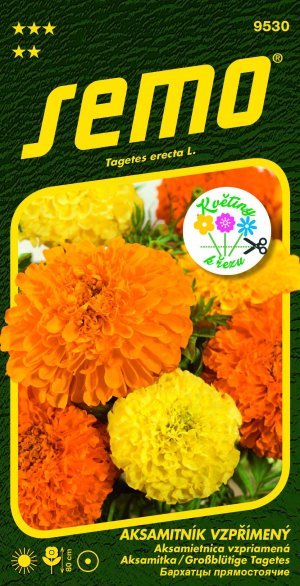Kolekce KVĚTINY K ŘEZU - nová série aksamitníků dosahuje výšky 80 cm a kvete velkými plnými sytě žlutými a oranžovými květy. Pevné stonky mají nafialovělou barvu s nádechem bronzové barvy na listech.
