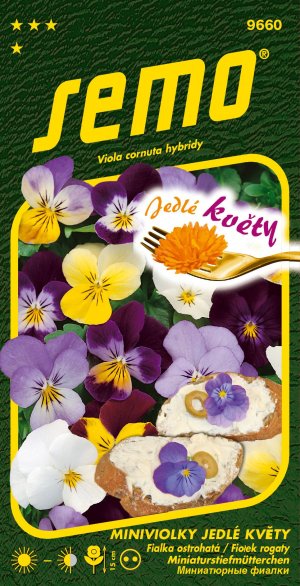 Miniviolka JEDLÉ KVĚTY - směs má fialové a modrožluté květy, kterým jsou přisuzovány afrodiziakální účinky a jejich nasládlá chuť a oku lahodící vzhled jsou přímo určeny k ozdobě a dochucení zeleninových mís a chlebíčků.