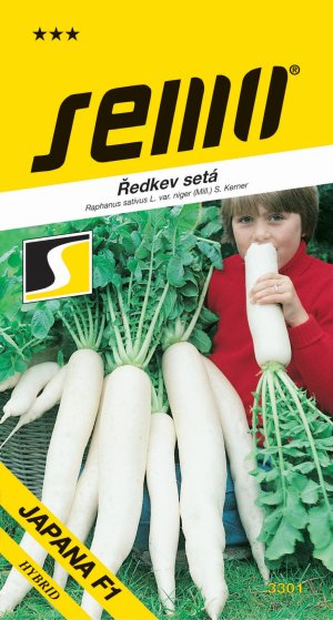 JAPANA - první česká odrůda typu DAIKON. Kořeny jsou válcovité, až 40 cm dlouhé, bílé. Dužnina je jemná, šťavnatá a kompaktní. Netrpí sklonem k houbovatění. Má intenzivní růst a krátkou vegetační dobu. Vzhledem k dlouhým kořenům vyžaduje lehčí, hluboce a dokonale zpracovanou půdu, velmi kvalitní kořeny poskytuje při pěstování na hrůbcích. V červenci – srpnu vyséváme špetky do hnízd 50 x 30 cm, po vzejití vyjednotíme na jednu rostlinu. Dobře se skladuje po celou zimu.