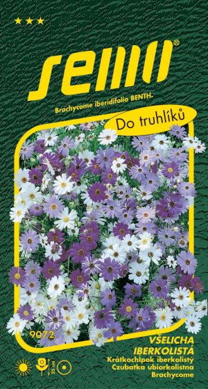 Rychle rostoucí, kompaktní, bohatě větvená letnička s drobnými, hluboce členěnými listy, původem z Austrálie. Po celé léto vytrvale kvete, úbory modrých, růžových a bílých květů, výška 25cm. Je vhodná do truhlíků, skalek a na okraje záhonů. Na zálivku je všelicha nenáročná, vyžaduje plné slunce a lehčí, dobře propustnou půdu.