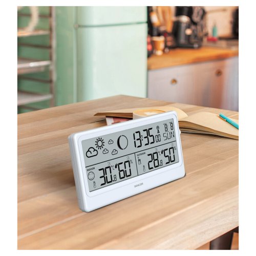 Díky pěkně vyvedenému displeji se informace snadno čtou i bez brýlí. Stanice dokáže předpovídat počasí a zobrazovat je ve formě grafických ikon „déšť“, „polojasno“, „jasno“ a dalších. Meteostanice SWS 3600 se dodává s venkovním senzorem, který umístíte například na zahradu. Signál v otevřeném prostoru funguje až na vzdálenost 80 metrů. Po spárování s meteostanicí se začne předpovídat počasí, změří se venkovní teplota i vlhkost. Meteostanici i snímač můžete postavit na pevný povrch nebo i zavěsit na zeď.