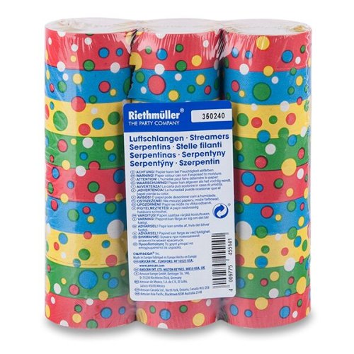 Papírové stuhy s puntíky v roli. Jedna role obsahuje 9 pruhů 14 mm x 4 m. Mix barev a velikostí puntíků. Balení 3 role.