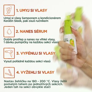Teplem aktivované sérum je finálním 4. krokem uhlazující rutiny Keratin Sleek, určené pro dosažení dlouhotrvajícího lesku a perfektně hladkých vlasů. Toto bezoplachové sérum je aktivováno teplem a poskytuje až 10 dní hladkosti a lesku, přičemž odolává až 5 umytím (instrumentální test). Chrání vlasy při tepelném stylingu až do 230 °C a je odolné vůči vlhkosti, což zajišťuje hladký a upravený vzhled i ve vlhkém počasí.