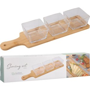 Servírovací sada 4 ks – 3 skleněné misky na bambusovém podnose