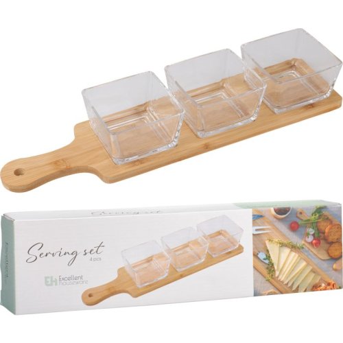 Elegantní a praktická sada pro servírování předkrmů, dipů nebo pochutin, která kombinuje čistotu skla s přírodní krásou bambusu.