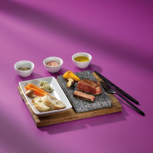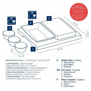 Sada skládající se z žulového talíře 20x12x2,5cm h s deskou z akáciového dřeva 29 x 23 x 2cm h včetně 3 bílých keramických misek 7x3cm h 1 bílý keramický talíř 20x13x3cm h