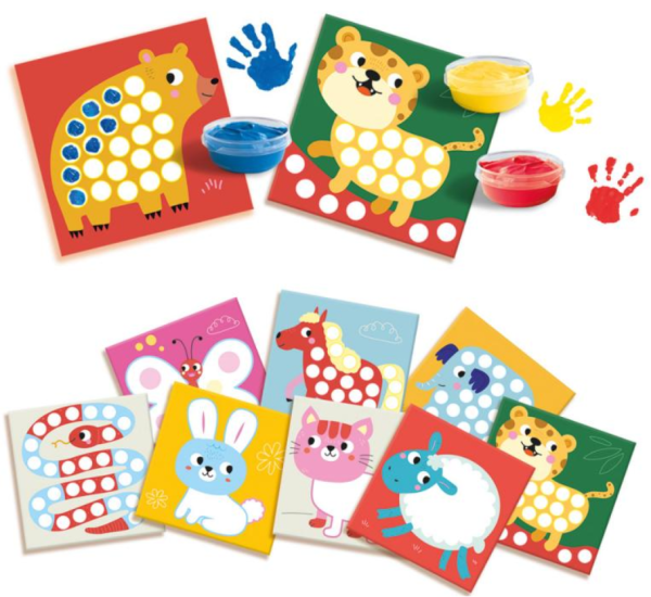 Kreativní tvoření pomocí dětských prstíků! Vytvořte své první umělecké dílo. Tato sada SES obsahuje tři prstové barvy a deset barevných šablon se zvířátky. Bíle plochy na šablonách můžete ozdobit libovolným způsobem. Zábavná aktivita pro rodiče s malými dětmi. Barvy jsou hypoalergenní a bez lepku. Hra rozvíjí motorické dovednosti. Sada obsahuje: 10 šablon se zvířátky, 3 prstové barvy (žlutá, červená, modrá). Vhodné pro děti od 1 roku.