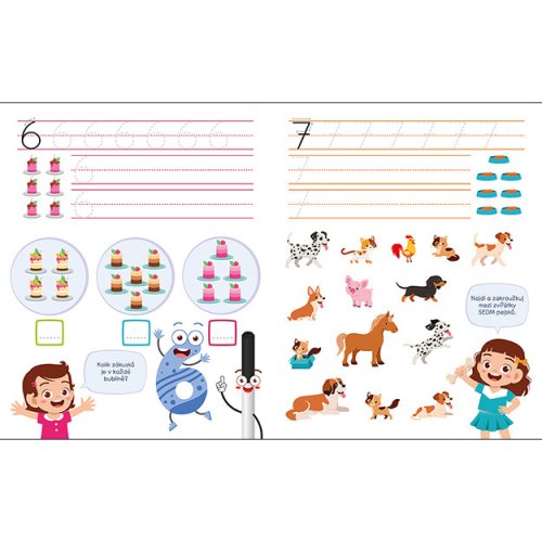 Titul obsahuje 22 stíratelných stran s úkoly pro trénování předškolních dovedností. Fix je součástí balení.