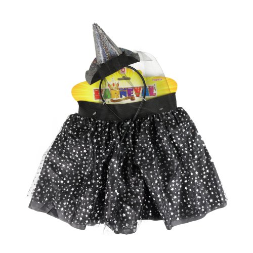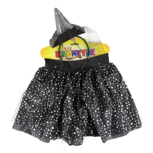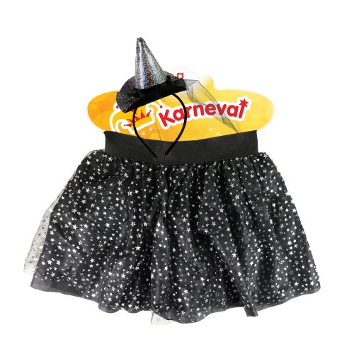 Bezva sada pro všechny malé parádnice čarodějnice! Sukýnka má černou spodničku, překrytou tylem s potiskem stříbrných hvězdiček. Je určena pro holčičky ve věkovém rozmezí 3-7 let. Délka sukně je 28 cm. Set je doplněn o čelenku s kloboučkem, který perfektně ladí k sukýnce. Skvěle se hodí i na oslavu Halloweenu nebo karneval!