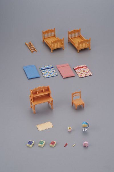 Dětský pokojíček s palandou obsahuje postele a stůl pro vytvoření dětského pokojíčku. Sada dětského pokojíčku je vybavena lůžky, které lze oddělit a použít samostatně, nebo společně jako poschoďová postel. Knihy a zeměkoule jsou součástí a zeměkoule se otáčí dokola. Polici na horní části stolu můžete odstranit, abyste vytvořili jednodušší stůl. Kombinace s dalšími figurkami a sady nábytku ze série dětských pokojů umožňuje ještě zajímavější hru (prodává se samostatně). Rozměr postýlky: 9,5x5x5,5 cm. Sada obsahuje: Postýlka 2x, žebřík, matrace 2x (modrá, červená), dětský stůl, židle. Polička, Mat, Tužka, Červené pero, Stojan na pero, Stolní hodiny, Kniha 3x, Globus (více než 15 kusů). Věk: 3+