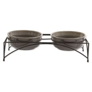 Keramické misky s potiskem tlapek s kovovým stojánkem.