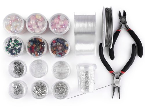 Velký korálkový set je vhodný pro začátečníky, ale i pokročilejší. Vše je uložené v praktickém plastovém boxu. Set obsahuje: - [plastový box - ketlovací kleště - štípací kleště - rozevírací jehlu na navlékání korálků - 7 dóziček s komponenty: afroháčky 10 ks, náušnicové zarážky 2 g, karabinky 10 ks, ketlovací nýty 100 ks, kaloty 20 ks, zamačkávací rokajl 1 g, protikroužky dvojité 5 g - nylonové lanko Ø 0,45 mm, 70 - 80 m - pruženku plochou šíře 1 mm, 10 m - silonový vlasec Ø 0,3 mm, 210 - 250 m - skleněné korálky ramš 2 x cca 75 g - skleněný rokajl 1 x 60 - 70 g - plastové korálky 3 x 100 ks] Barvy či tvary korálků vyobrazené na fotografiích se mohou drobně odlišovat.