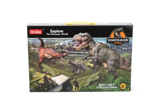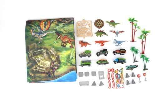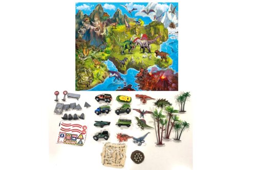 Hrací set s figurkami dinosaurů, autíčky a dalšími hracími prvky.