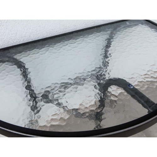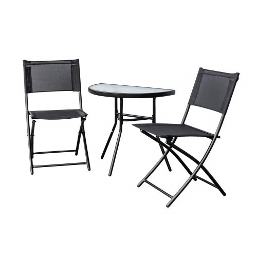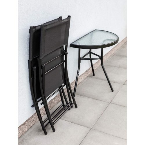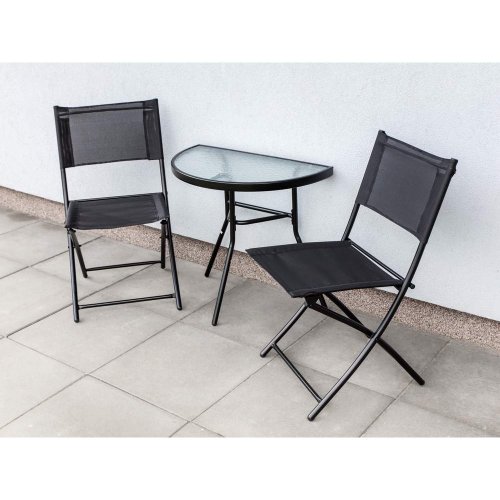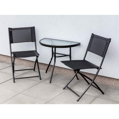 set obsahuje: 1 x půlkruhový stůl s prosklenou vrchní deskou, rozměry 70 x 40 x 63 cm 2 x skládací židle, s textilenovým výpletem 2 x 1, rozměry 55 x 45,5 x 78 cm