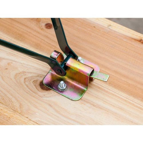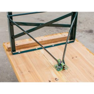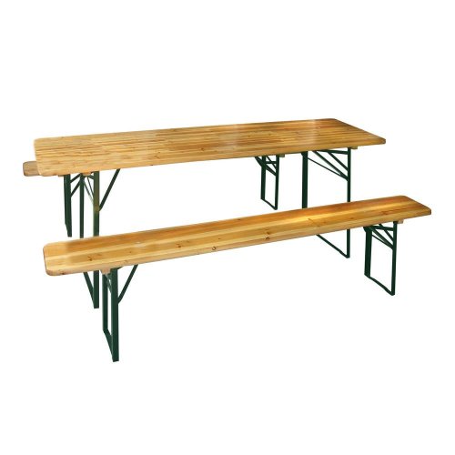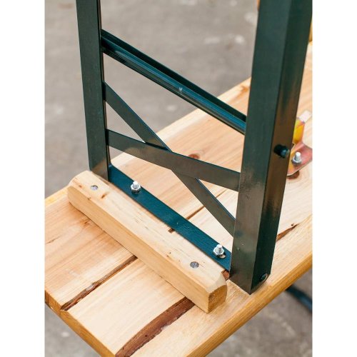 Zahradní pivní set je vyroben z kovové konstrukce o síle materiálu 0,2 cm, tmavě zelené barvy. Latě jsou z přírodního dřeva o tloušťce 2,45 cm.