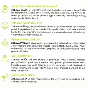 Výhody Zdravé lahve, * neobsahuje ftaláty ani změkčovadla, * zcela nový materiál bez těžkých kovů a Bisfenolu A, * s uzamykatelnou zátkou - těsná i pro sycené nápoje, * nízká hmotnost, * praktické transparentní provedení, * pro nápoje až do 100 °C, * EKOLOGICKY ŠETRNÁ (plně recyklovatelná a při její výrobě nejsou používány látky zatěžující životní prostředí), * vyrobeno v ČR, OBJEM: 0,5 L, VÝŠKA LAHVE VČETNĚ ZÁTKY A PÍTKA: 18,5 CM , , Výhody boxu Zdravá sváča, * originální čirá průhledka pro vložení vašich obrázků či fotografií, * vyjímatelná dělicí přepážka, * neobsahuje ftaláty, změkčovadla, BPA a BPS, * pevné panty, které umožňují víčko zcela otevřít bez toho, aby se krabička překlopila, * vhodný do myčky, ledničky, mrazničky a mikrovlnné trouby, * možnost dokoupení náhradních dílů – barvy můžete kombinovat a vytvořit si tak velké množství barevných variant, * vyrobeno v ČR, ROZMĚRY BOXU: 18 X 13 X 6,5 CM, Údržba Zdravé lahve, * široký otvor pro plnění i čištění, * možno opakovaně mýt v myčce, * lze vyvařit jako kojeneckou láhev (teplota 100 °C po dobu 5 minut), * lze krátkodobě ohřívat v mikrovlné troubě (900 W po dobu 2 minut), * láhev skladujte otevřenou, PŘÍSLUŠENSTVÍ , * Termoobaly - odolný neoprenový termoobal s vynikajícími termoizolačními vlastnostmi. V zimě udrží nápoj teplý, v létě chladný a osvěžující., * Kompletní víčko - ať už z důvodu náhrady opotřebění nebo barevného odlišení., * Zátky - pro případ, kdy ostré dětské zoubky zdeformují zátku natolik, že už nedokáže Zdravou lahev spolehlivě utěsnit, si můžete objednat i pouze samostatnou zátku., * Těsnění - dlouhodobé používání Zdravé lahve může vést k mírnému opotřebení pružného těsnícího "O" kroužku na víčku lahve., * Hubice - pro akční sportovní chvíle., * Krytka na zátku - udržuje pítko v čistotě a zabraňuje úniku nápoje i ve vodorovné poloze., * Šejkr - sítko - adaptér ke Zdravé lahvi, který z ní udělá plnohodnotný šejkr. Nasadí se delším trnem do víčka a po použití se mírným pootočením vyjme., KE STAŽENÍ, PŘÍBALOVÝ LETÁK ZDRAVÁ LAHEV (66 KB), PROHLÁŠENÍ O SHODĚ ZDRAVÁ LAHEV (151 KB), [český výrobek], -------------------------, [Vítěz nezávislého testu MF Dnes] , ZDRAVÁ LAHEV® SE STALA S VÝSLEDNOU ZNÁMKOU 1,1 ZASLOUŽENĚ VÍTĚZEM NEZÁVISLÉHO TESTU MF DNES, A MŮŽE SE TAK PYŠNIT TÍMTO OZNAČENÍM. , PODROBNOSTI O TESTU