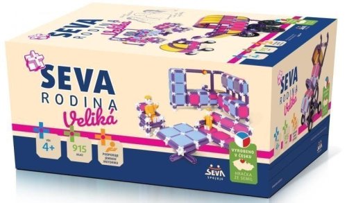 Seva RODINA Veliká - XL velké balení stavebnice od Visty, ze které si můžete sestavit např. dětský kočárek, obývací stěnu a další modely podle vaší fantazie nebo vyobrazení na krabici. Seva je známá a velice originální, česká, polytechnická od českého výrobce Vista. S dostatkem dílků je možné se stavebnicí SEVA postavit v podstatě cokoli. Její koncepce je založena na několika málo různých dílech, které je možné libovolně kombinovat, takže mohou vznikat úžasná a originální díla. Princip stavby je velice jednoduchý nejprve vytvoříte kostru z modrých dílků, které spojíte bílými kostičkami. Dle potřeby pak přidáte žluté či červené čtverce jako stěny u domků či karoserii u aut. Jednoduché věci zvláde postavit i pětileté dítě. Bavit však může tato stavebnice díky své originalitě i dospělé.Balení se může lišit,buď v kvádrové krabici, nebo v šesti-bokém válci. Rozměry balení (š v h): 38 x 27 x 18cm Materiál: plast Počet dílků: 915 Vyrobeno v Česku. Cena je uvedena za 1 balení hračky Hračka je vhodná pro děti od 4 let