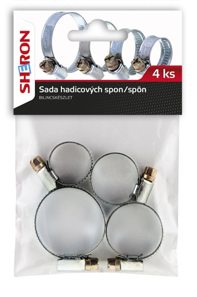 SHERON Sada hadicových spon je sada pozinkovaných hadicových spon ve čtyřech rozměrech: 12-22 mm, 16-28 mm, 20-32 mm a 25-40 mm.