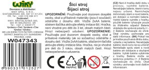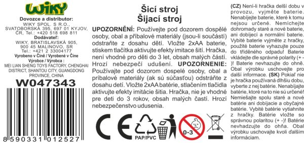Šicí stroj s efekty. Velikost 14 cm. Vydává světelné a zvukové efekty. Přesné rozměry 15x7x14 cm. Baterie 2xAA nejsou součástí balení.